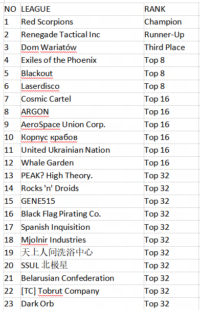 Subcapital Bracket Top 8 Showdown: Exiles of the Phoenix, Blаckout, and Laserdisco. These three Corporations must conduct a round-robin series of 1v1 matches, meaning each Corporation will play exactly two matches. The Corporation with the highest total number of match wins will be awarded Fourth Place.